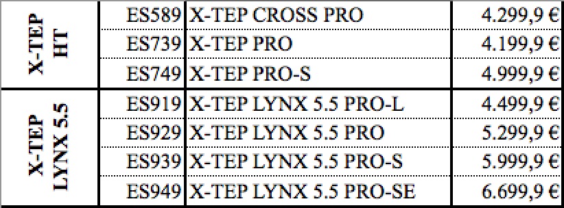 La gamma Xtep comprende 4 modelli a sospensione doppia, che vanno da 4.499 € a 6.699 € della Lynx 5.5 PRO-SE, punta di diamante, dotata di cambio elettronico Shimano XT Di2 e sospensioni anteriori Fox 36 Performance e posteriori Fox Float DPS Factory.