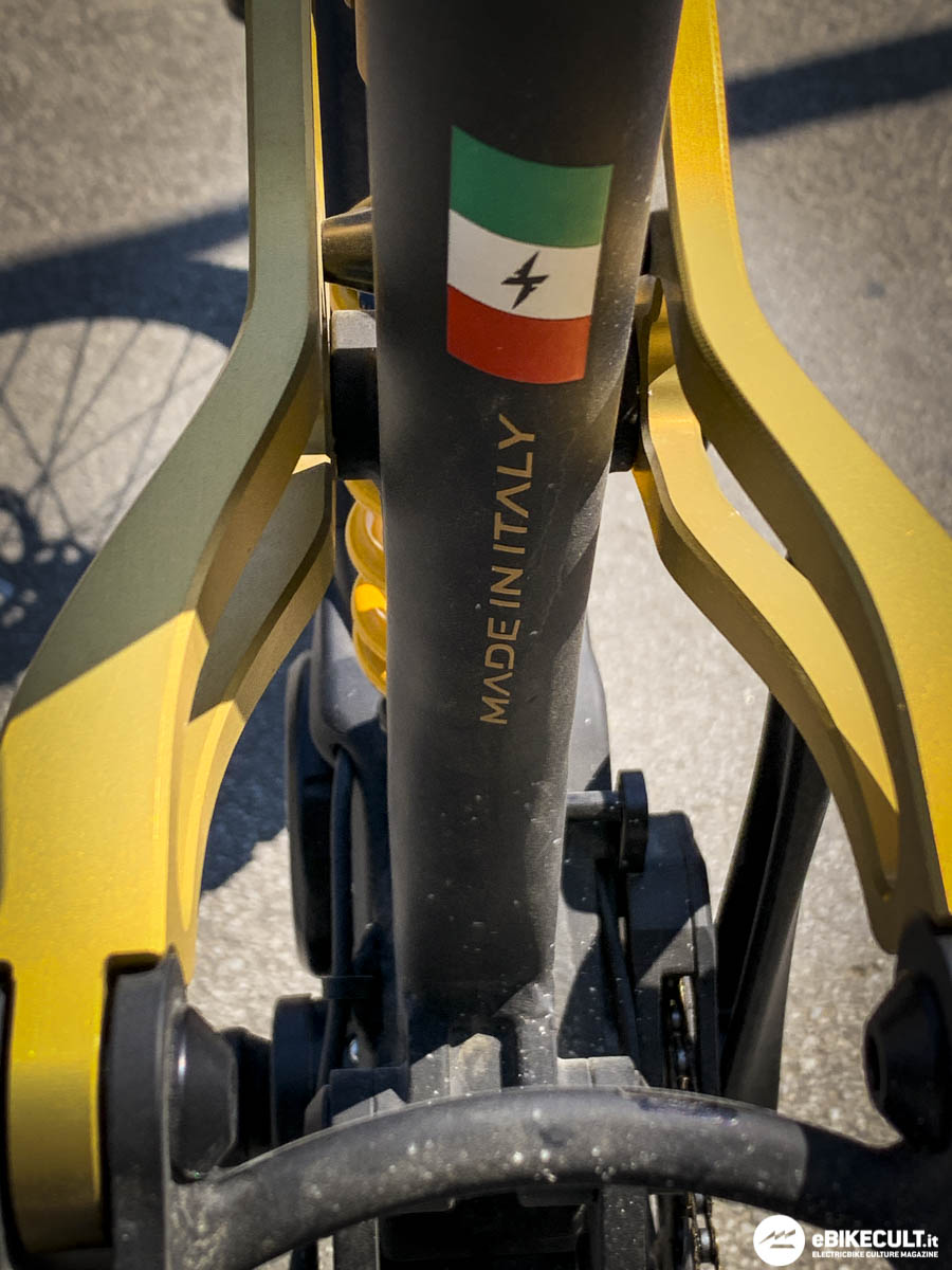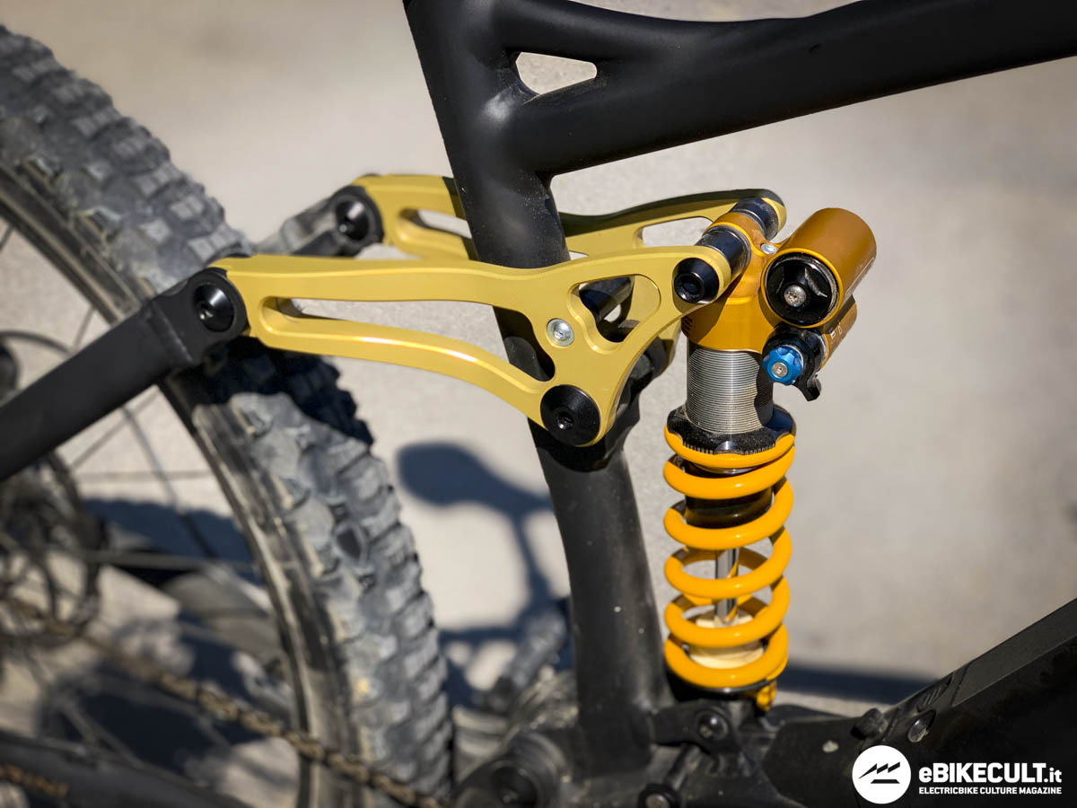 Lo schema sospensivo è un quadrilatero abbastanza classico, con giunto Horst e un bilanciere superiore di dimensioni generose, ricavato dal pieno al CNC e anodizzato oro.