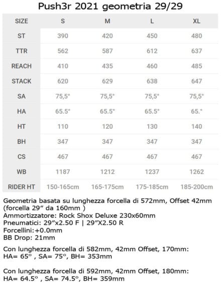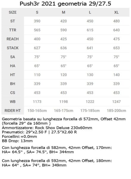 Per la Push3r il valore di altezza da terra è di 339mm per la versione 29”/27.5” e 350mm per la versione 29”/29”.