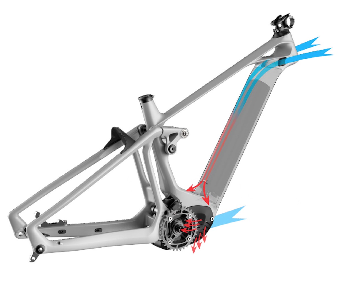 Il tubo orizzontale ha un sistema di raffreddamento ad aria per la batteria, con prese di ingresso sulla zona dello sterzo con una piccola apertura di sfogo vicino la zona piantone sella. Per il motore, invece, ci sono delle piccole asole che convogliano l’aria sullo stesso.
