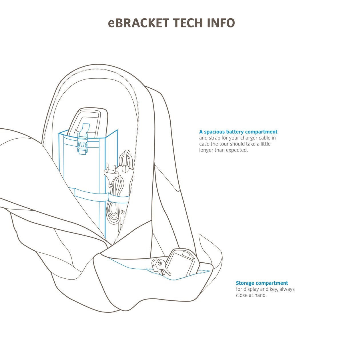 Stefan Schlie, partner di sviluppo, sostiene: «Nell’e-bike ciò che conta sono il comfort e il divertimento in sella. Non ci si deve preoccupare di ogni grammo dell’attrezzatura, lo zaino può quindi essere anche leggermente più grande. Una buona organizzazione e un comfort elevato diventano però imprescindibili quando si trascorre l’intera giornata per strada. Con il modello E-Bracket si è tenuto esattamente conto di questi aspetti.»